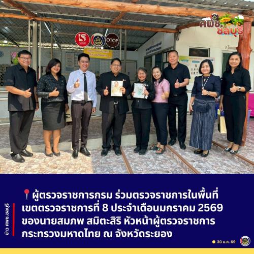 นางสาวมนทิรา เข็มทอง ผู้ตรวจราชการกรม ปฏิบัติหน้าที่ผู้อำนวยการศูนย์ศึกษาและพัฒนาชุมชนชลบุรี ร่วมลงพื้นที่การตรวจราชการในพื้นที่เขตตรวจราชการที่ 8 (ฉะเชิงเทรา ชลบุรี ระยอง) พื้นที่จังหวัดระยอง ประจำเดือนมกราคม 2569 ของนายสมภพ สมิตะสิริ หัวหน้าผู้ตรวจราชการกระทรวงมหาดไทย โดยมีนางสาวพุทธิมาลย์ เชียรพิมาย พัฒนาการจังหวัดระยอง พร้อมนายประภาศ ขุนคต พัฒนาการอำเภอบ้างฉาง ผู้อำนวยการกลุ่มงาน เจ้าหน้าที่กรมการพัฒนาชุมชน และผู้นำชุมชน เครือข่ายงานพัฒนาชุมชน ร่วมให้การต้อนรับโดยพร้อมเพรียง