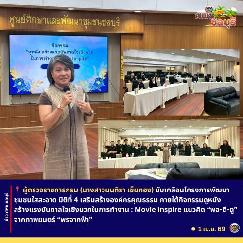 นางสาวมนทิรา เข็มทอง ผู้ตรวจราชการกรม ปฏิบัติหน้าที่ ผู้อำนวยการศูนย์ศึกษาและพัฒนาชุมชนชลบุรี ร่วมขับเคลื่อนโครงการพัฒนาชุมชนใสสะอาด มิติที่ 4 เสริมสร้างองค์กรคุณธรรม ภายใต้กิจกรรมดูหนังสร้างแรงบันดาลใจเชิงบวกในการทำงาน : Movie Inspire แนวคิด “พอ-ดี-ดู” จากภาพยนตร์สร้างแรงบันดาลใจ “พรจากฟ้า” (A Gift) มาเป็นสื่อกลางในการถ่ายทอดองค์ความรู้และสร้างแรงบันดาลใจด้านการดำเนินชีวิตตามหลักปรัชญาของเศรษฐกิจพอเพียงและจิตอาสาให้กับบุคลากรศูนย์ศึกษาและพัฒนาชุมชนชลบุรี จำนวน 26 คน