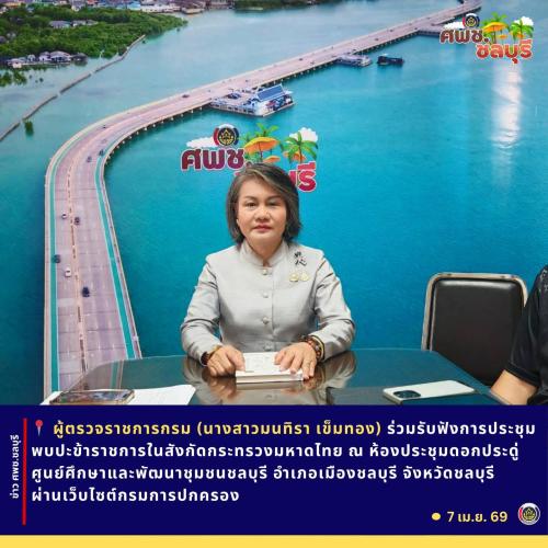 ศพช.ชลบุรี ร่วมรับฟังการประชุมพบปะข้าราชการในสังกัดกระทรวงมหาดไทย ณ ห้องประชุมดอกประดู่ ศูนย์ศึกษาและพัฒนาชุมชนชลบุรี อำเภอเมืองชลบุรี จังหวัดชลบุรี ผ่านเว็บไซต์กรมการปกครอง