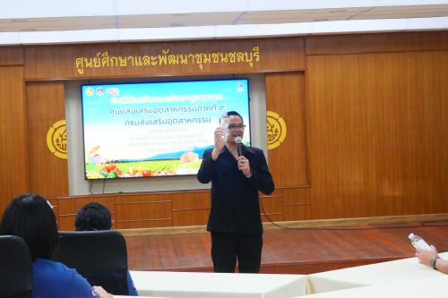 นางสาวมนทิรา เข็มทอง ผู้ตรวจราชการกรม ปฏิบัติหน้าที่ผู้อำนวยการศูนย์ศึกษาและพัฒนาชุมชนชลบุรี นำบุคลากร ศพช. ชลบุรี ต้อนรับคณะศึกษาดูงานจากศูนย์ส่งเสริมอุตสาหกรรมภาคที่ 9 กรมส่งเสริมอุตสาหกรรม