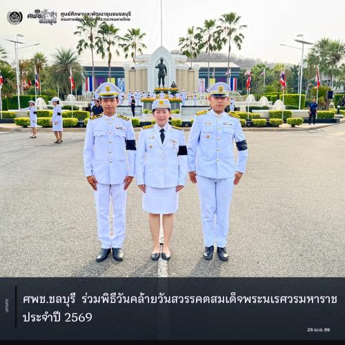 นางสาวมนทิรา เข็มทอง ผู้ตรวจราชการกรม ปฏิบัติหน้าที่ ผู้อำนวยการศูนย์ศึกษาและพัฒนาชุมชนชลบุรี มอบหมายให้เจ้าหน้าที่ศูนย์ศึกษาและพัฒนาชุมชนชลบุรี เข้าร่วมพิธีวันคล้ายวันสวรรคตสมเด็จพระนเรศวรมหาราช ประจำปี 2569 และร่วมวางพวงมาลาถวายราชสักการะ ณ ลานพระบรมราชานุสาวรีย์สมเด็จพระนเรศวรมหาราช กรมทหารราบ 902 รักษาพระองค์ฯ อำเภอเมืองชลบุรี จังหวัดชลบุรี